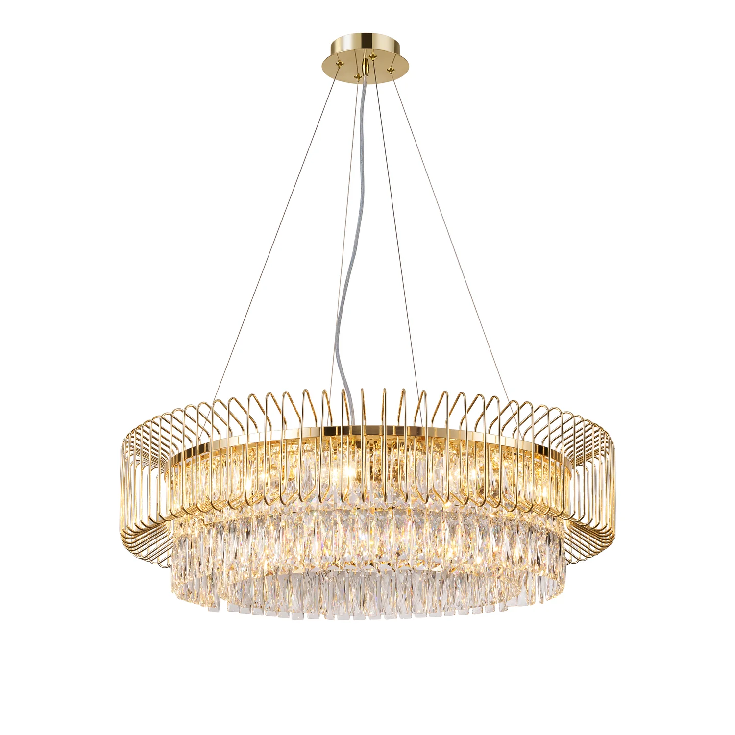 Коллекция люстр Subito удачно сочетает в себе черты классического и современного дизайна. В нее входят две большие хрустальные люстры. Их основание выполнено из металла с износостойким гальваническим покрытием золотого цвета и дополнено каскадом из крупных хрустальных медальонов в центре люстры. Облик люстр дополняют декоративные металлические трапеции, расположенные по периметру, которые завершают композицию и привносят в дизайн современные черты. Благодаря эклектичному сочетанию решений, позаимствованных из разных стилевых направлений, люстры Subito смогут стать доминантой любого интерьера, улучшив его эстетические характеристики.