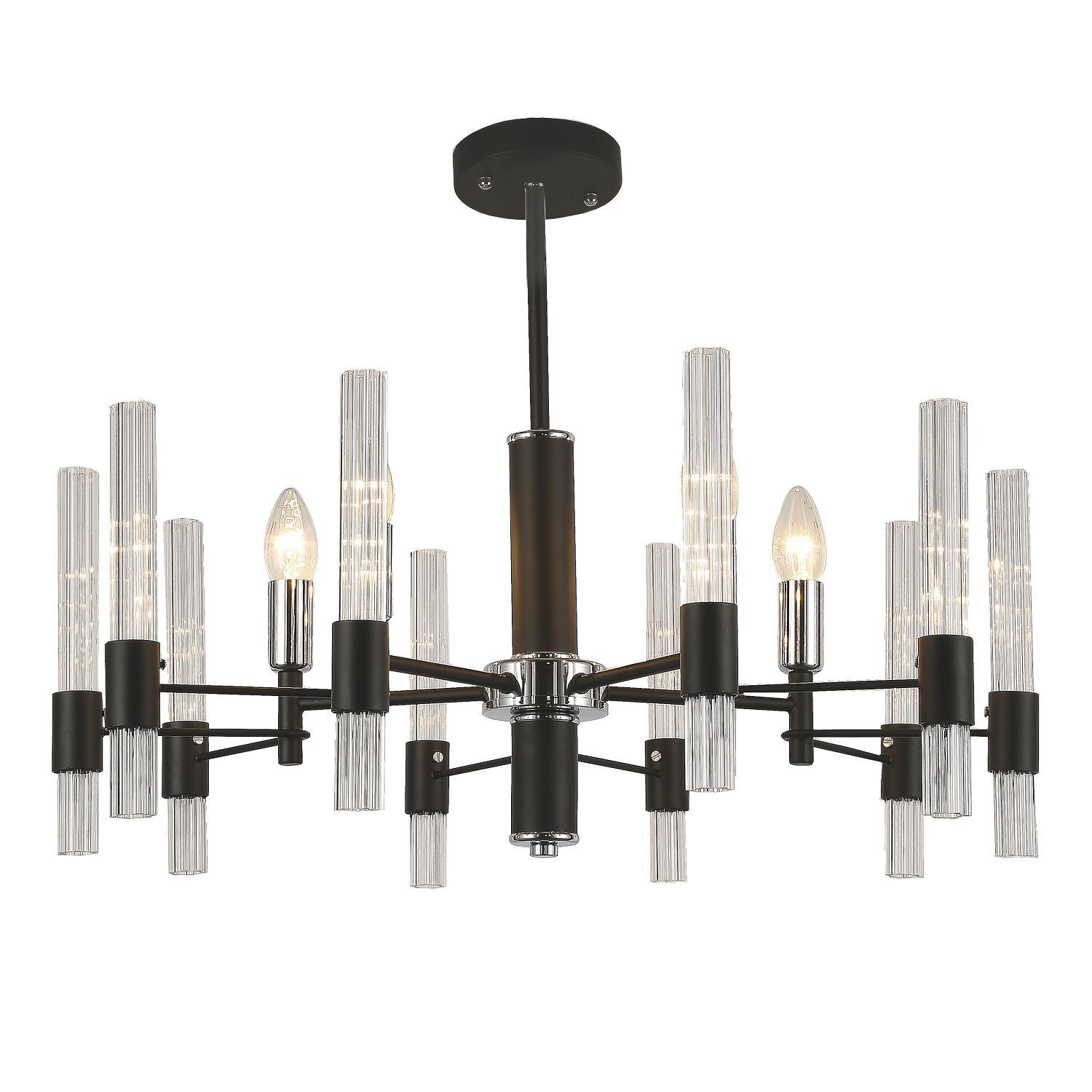 Современная коллекция Supreme в двух цветовых решениях декорирована трубками из рифленого стекла, расположенных перпендикулярно каждому рожку. Изюминкой светильника является хромированный патрон и акцентные детали на каркасе, сочетающиеся по цвету. Открытый источник света позволит добиться равномерного освещения комнаты, подойдет для помещений с небольшой высотой потолка.