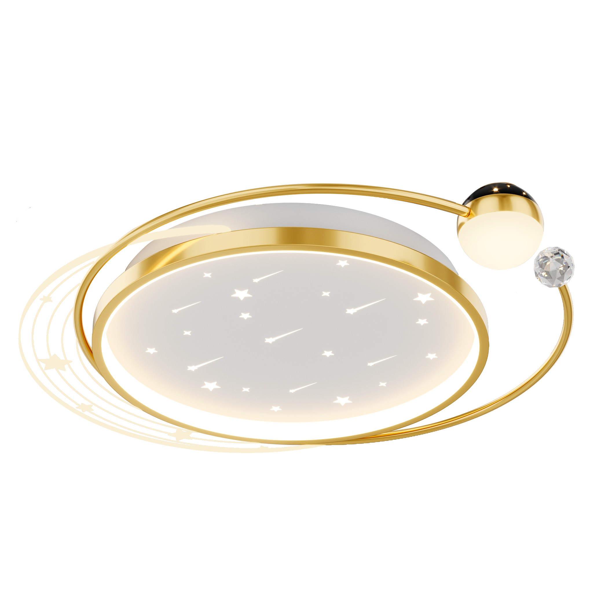 Коллекция потолочных светильников Cruise станет не только стильным элементом интерьера, но и наполнит вашу комнату волшебством. Главной особенностью светильников этой коллекции является дополнительный плафон, который создает эффект звездного неба на потолке, наполняя пространство атмосферой уюта и романтики. Каждый светильник украшен крупным кристаллом, который добавляет изысканности, а декоративный элемент из прозрачного акрила с гравировкой звезд придает уникальность и шарм. Ещё одним преимуществом этой коллекции является возможность регулировки температуры освещения от теплого желтого, до холодного белого цвета при помощи идущего в комплекте пульта. Основным источником света является белый акриловый плафон со звездами, обрамленный каркасом черного или золотого цвета. Такое сочетание делает светильники Crusie универсальны решением, которое идеально дополнит интерьер детской, спальни или гостиной.
