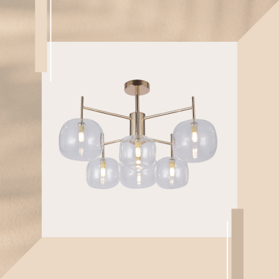 в центре внимания. Каркас цвета золота, плафоны из прозрачного выдувного стекла разного размера добавят изюминки в интерьер в стиле минимализма.