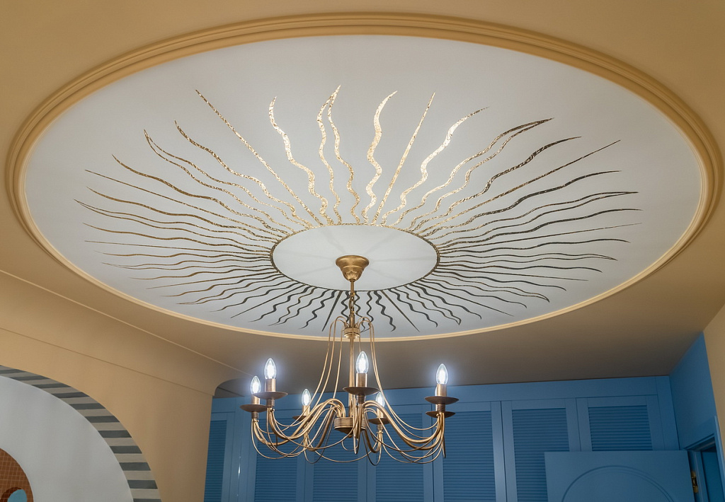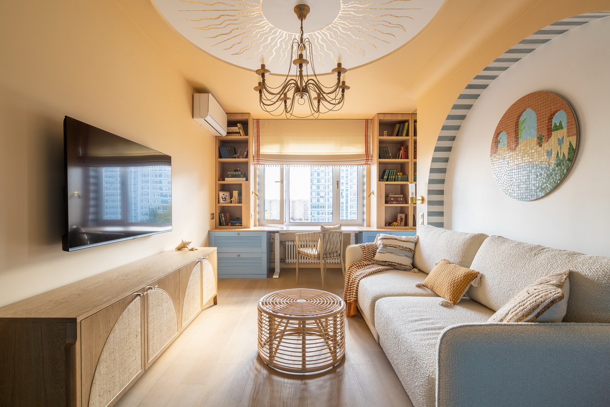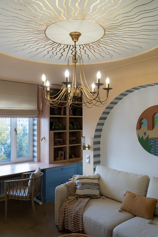 Песочные тона, глубокий синий, округлые арки и наш свет, который подчеркнул уют и выявил всю глубину дизайнерской палитры.