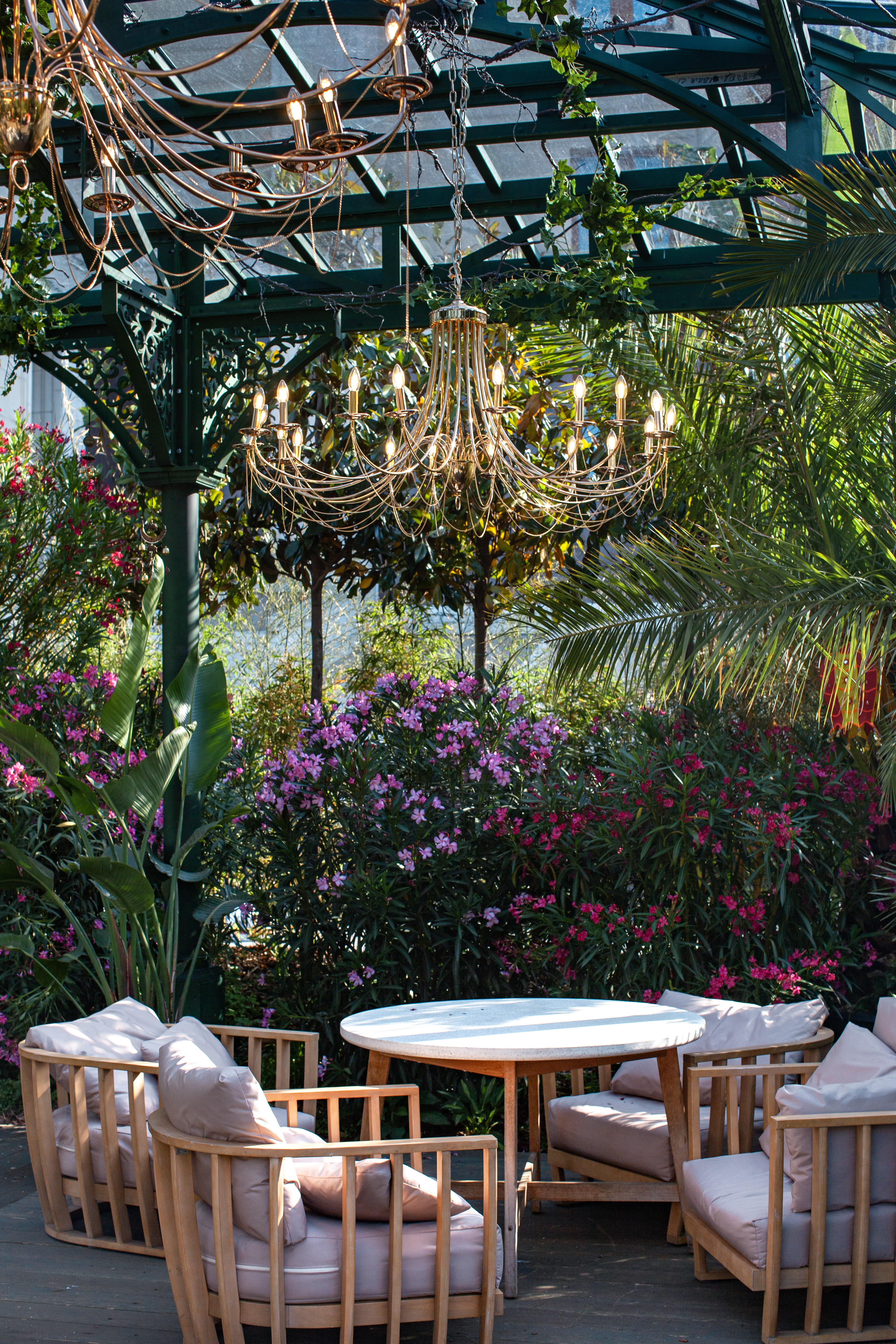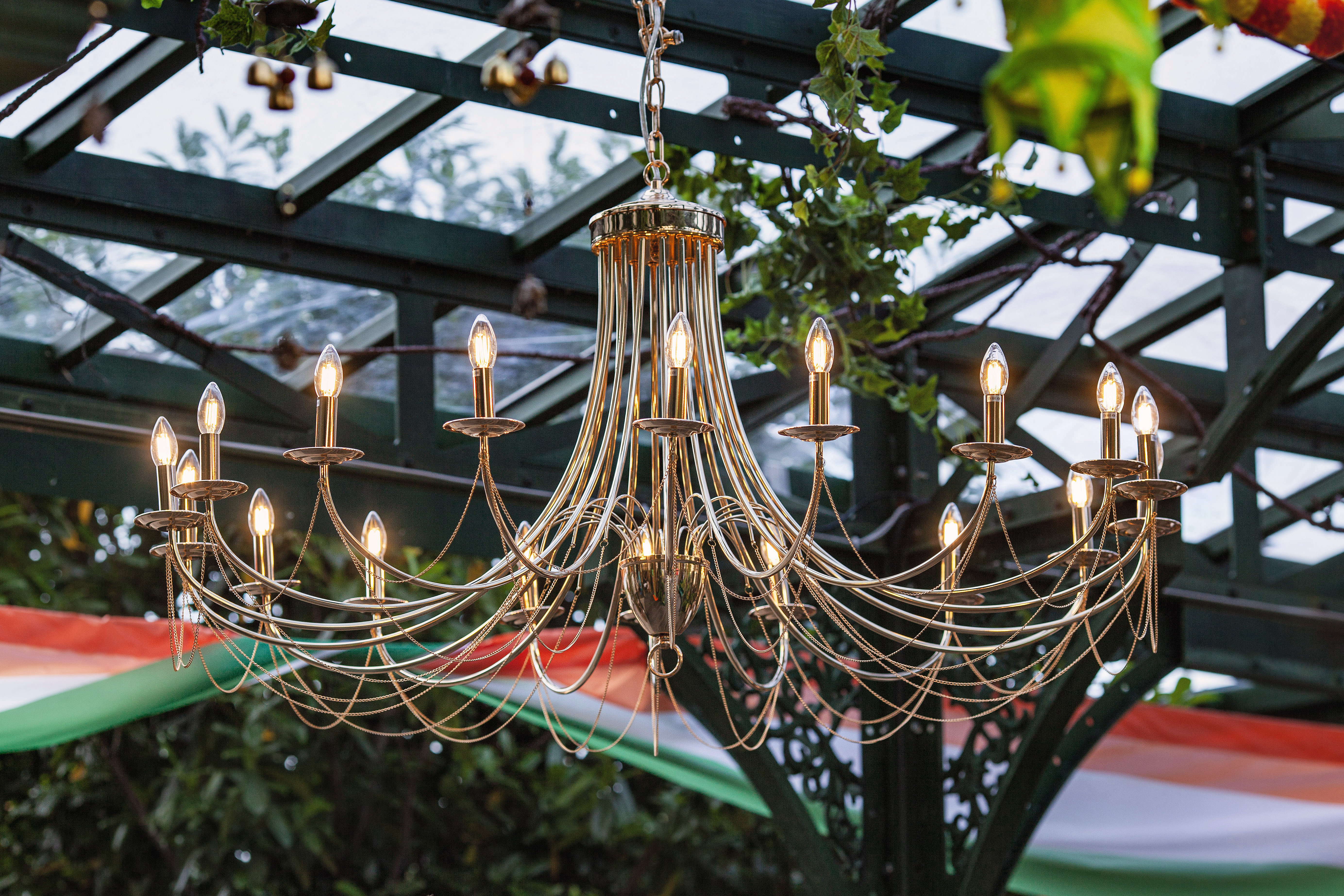 Обрамлённые зеленью и декоративными гирляндами, люстры Plini смотрятся изысканно и торжественно. Металлический блеск, изящные рожки и цепочки добавляют свету архитектурную выразительность, а самому пространству — утончённость и уют.