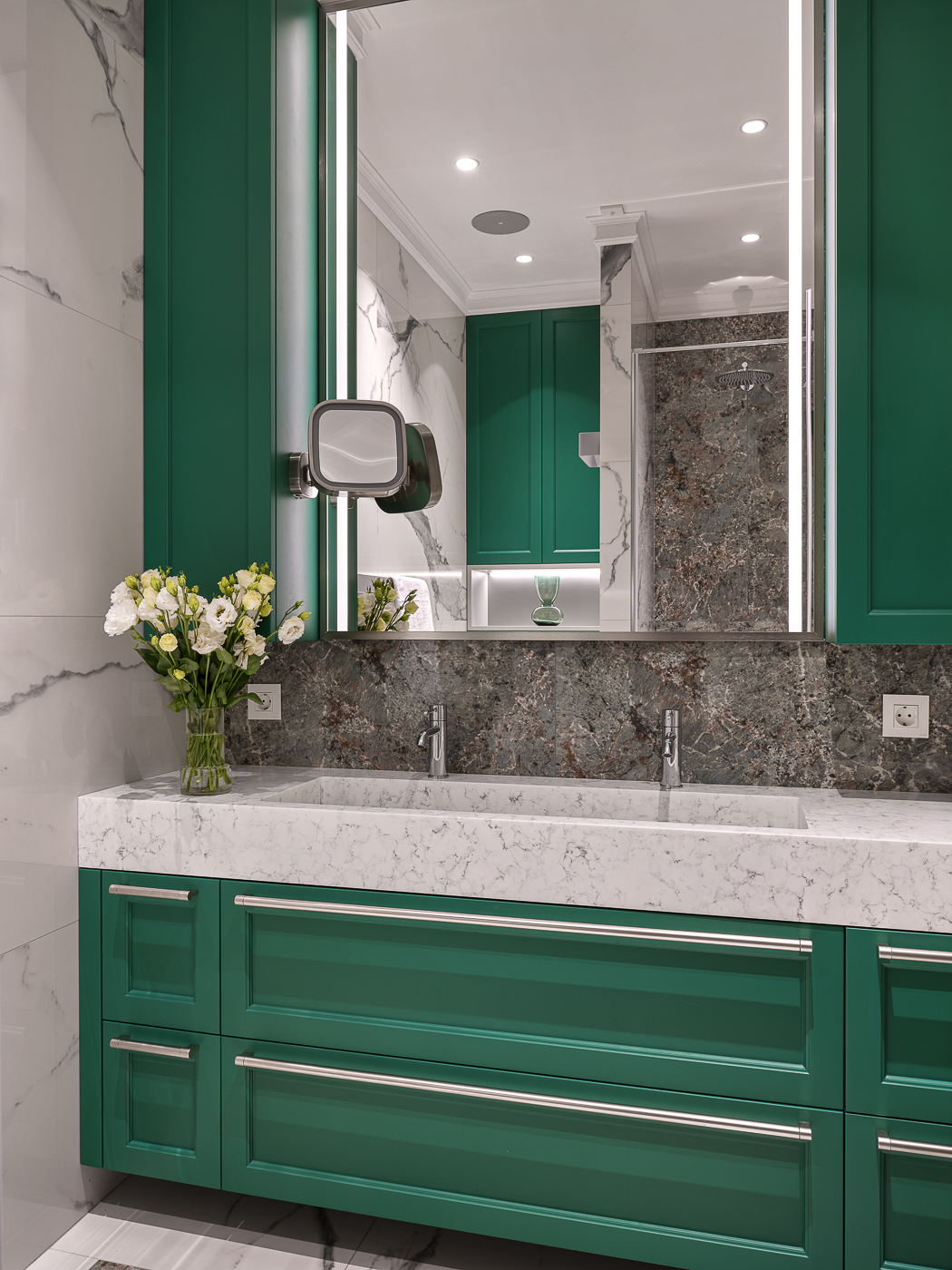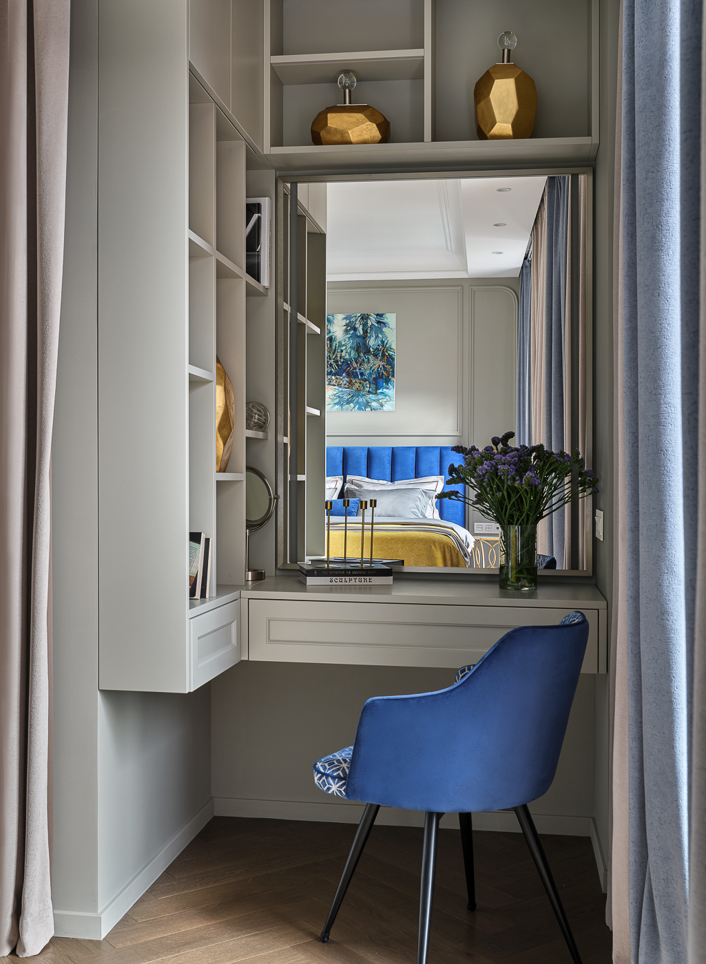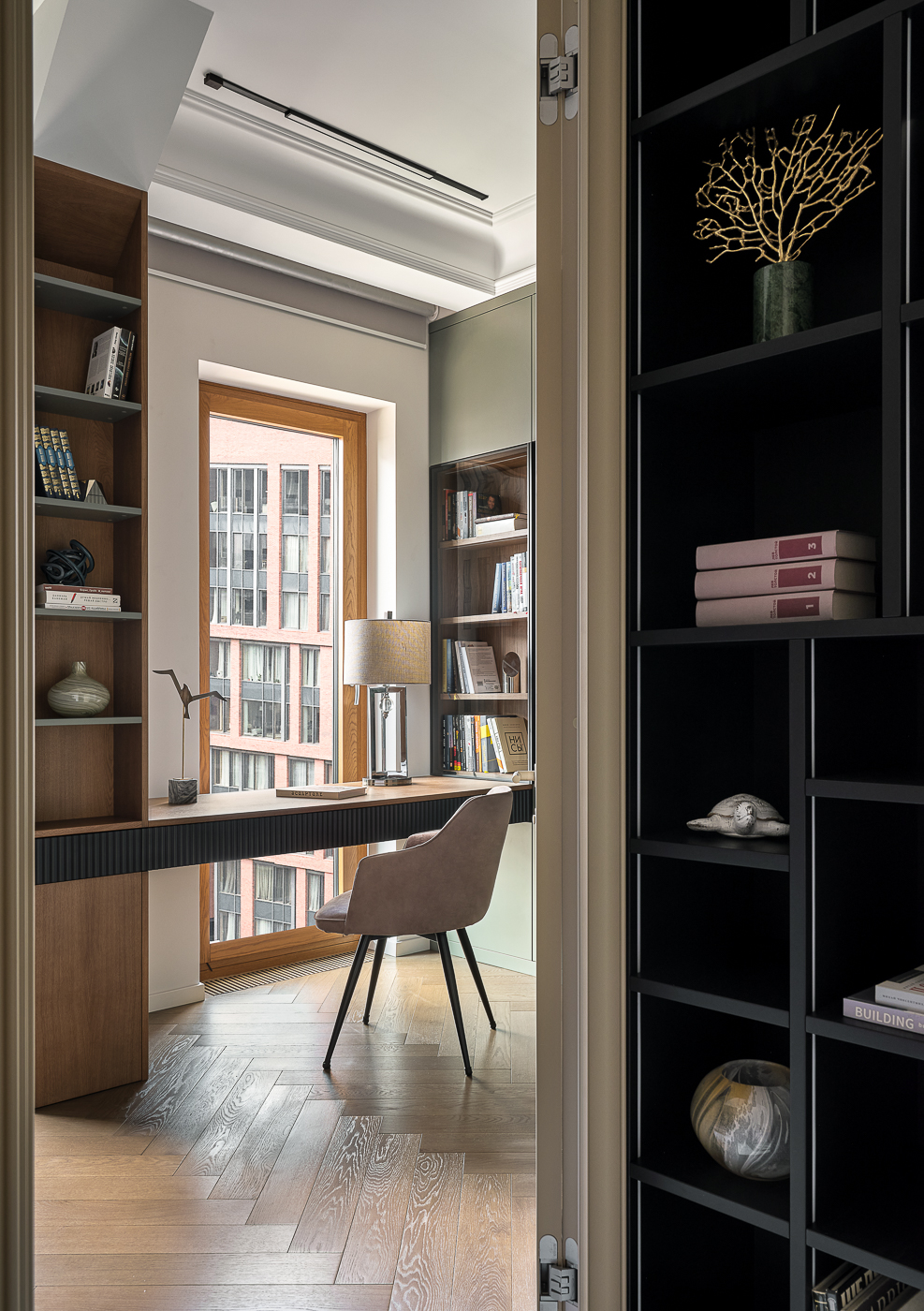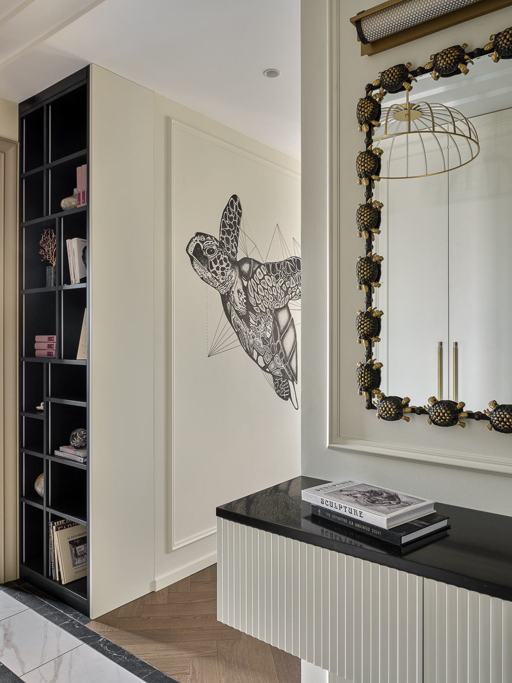 Заказчики коллекционируют фигурки черепах из разных стран — и дизайнер превратил этот личный код в тонкий мотив, который сквозит в интерьере: на зеркале, в графике, в аксессуарах.