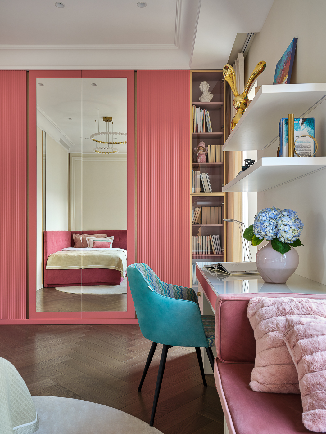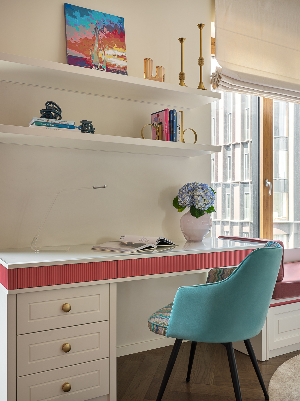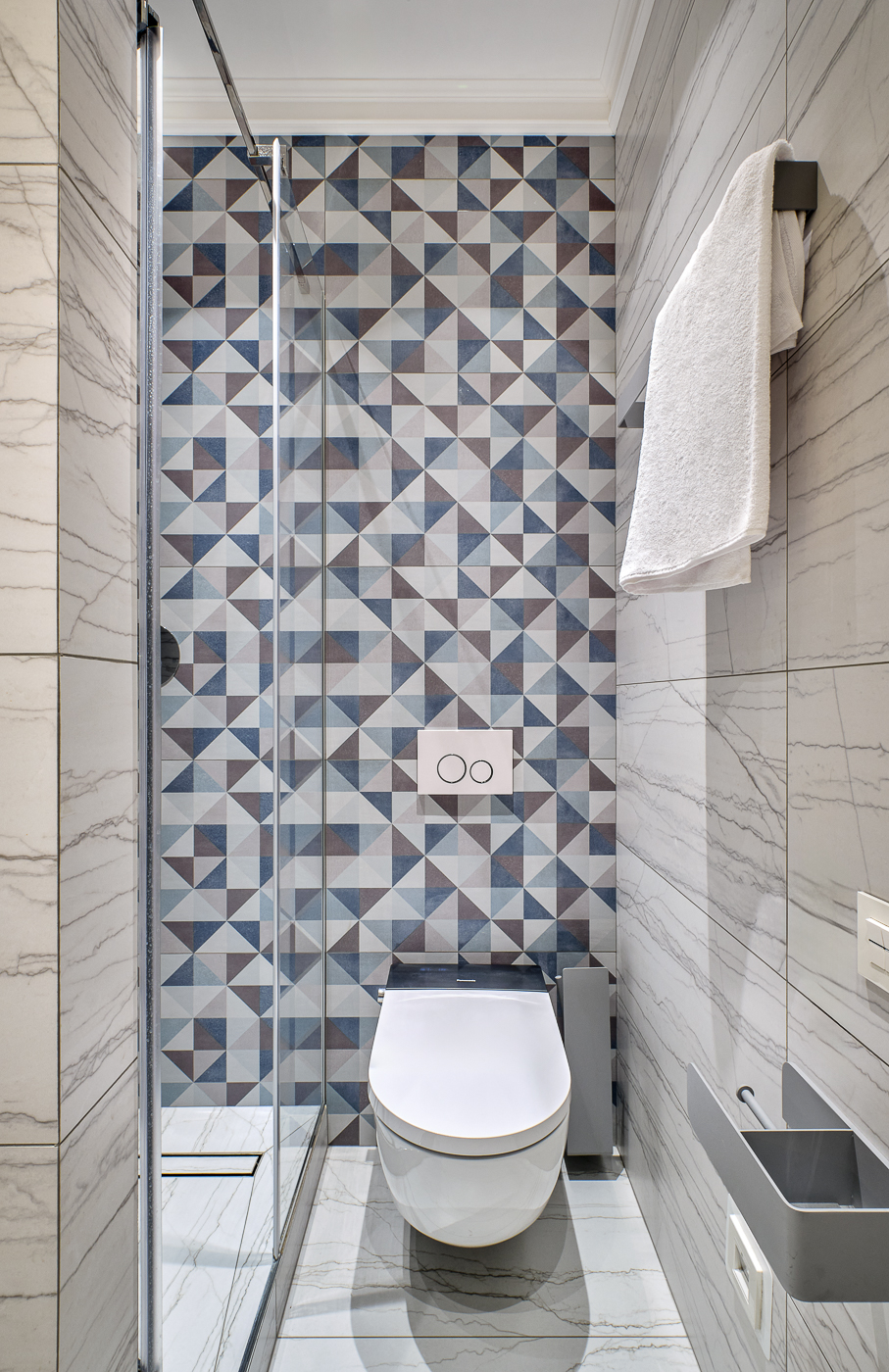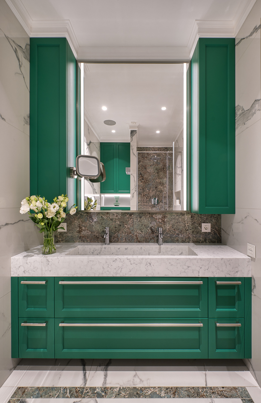 Заказчики коллекционируют фигурки черепах из разных стран — и дизайнер превратил этот личный код в тонкий мотив, который сквозит в интерьере: на зеркале, в графике, в аксессуарах.