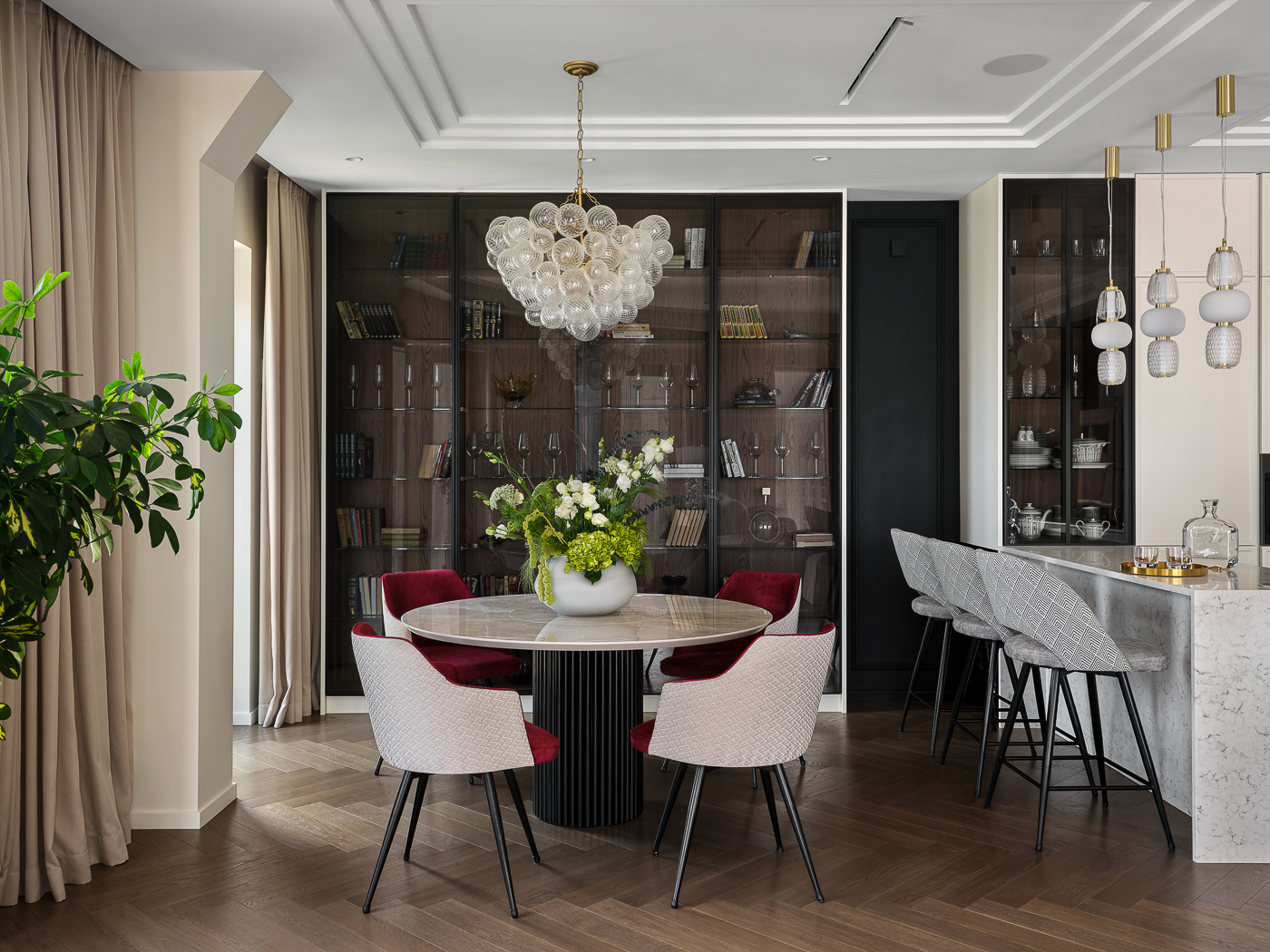 Интерьер получился зрелым и живым — где классика дышит современностью, а свет превращает пространство в эмоцию.