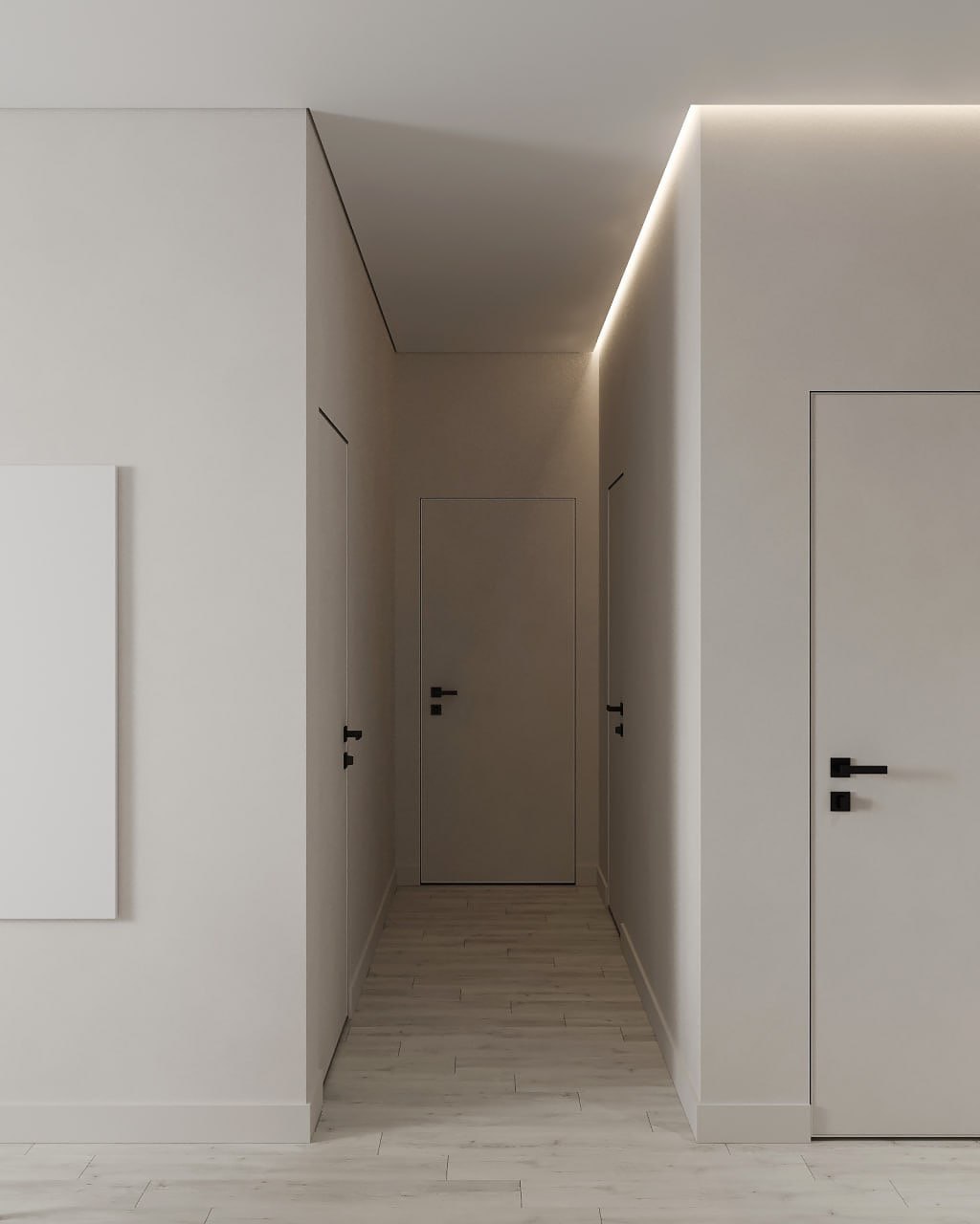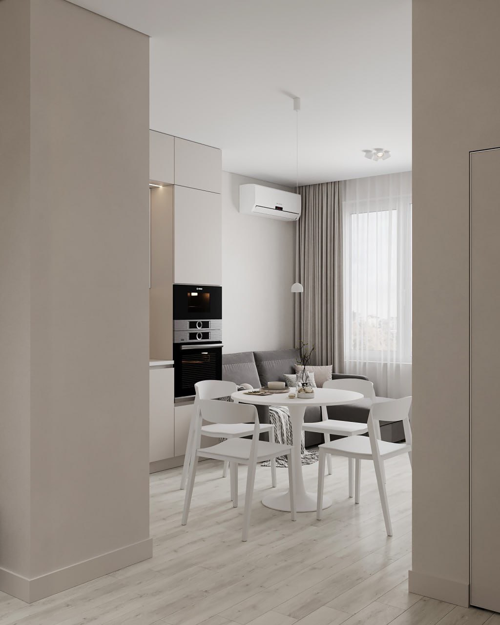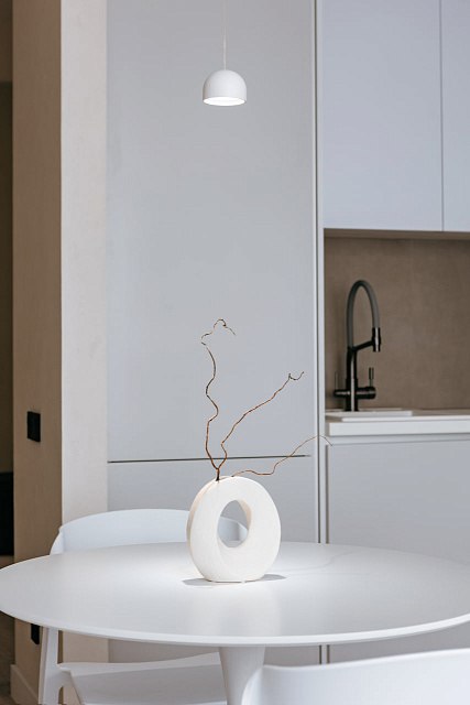 Минималистичный интерьер в светлых, ванильных оттенках который сочетает в себе функциональность и эстетику. Пространство, где главная идея дизайн студии — использовать нейтральные цвета с акцентами в виде оригинального освещения и картин, которые студия распишет для этой квартиры.